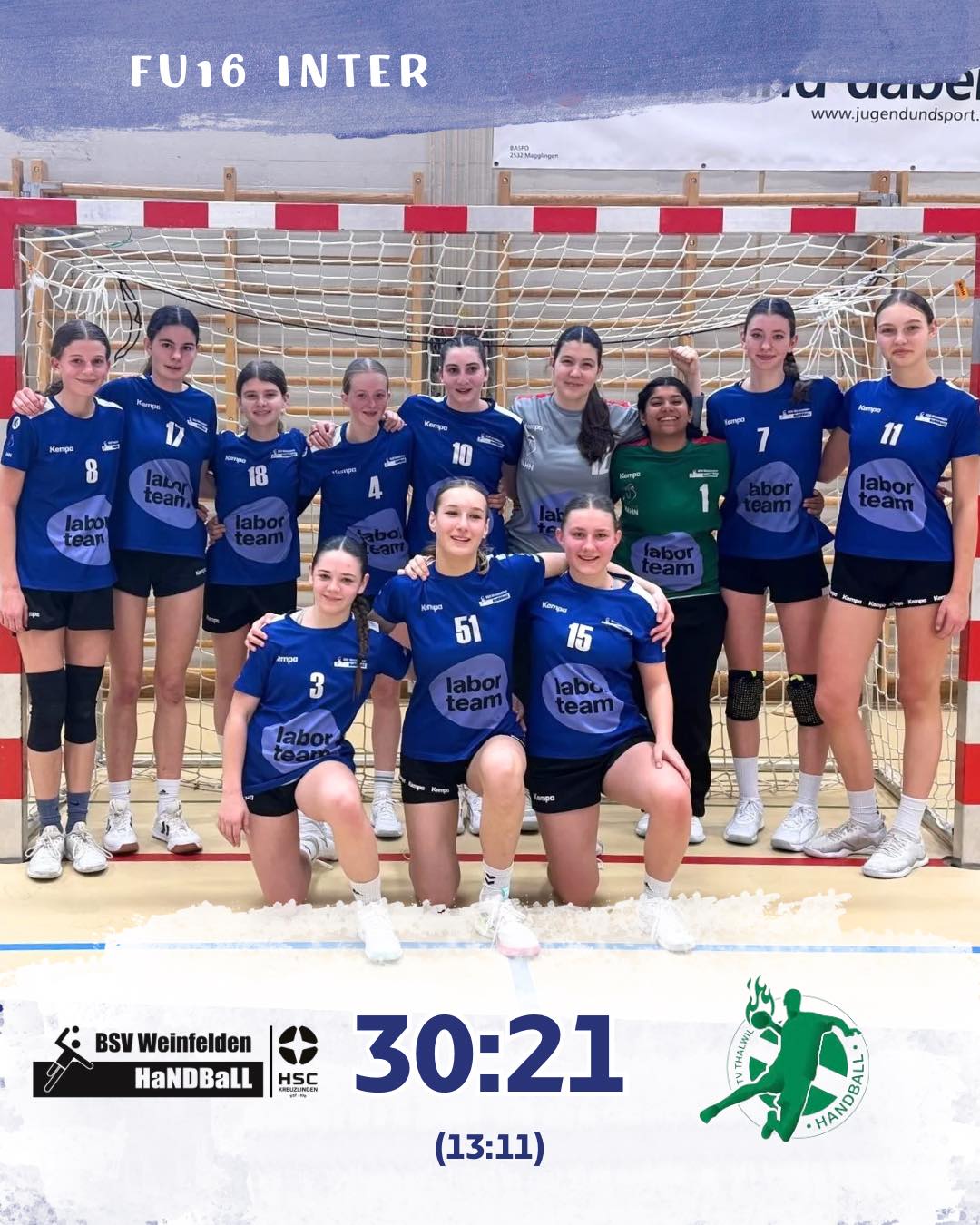 In der zweiten Halbzeit konnte die BSV-lerinnen die Führung weiter ausbauen und gewannen den Spitzenkampf mit 30:21. Nach fünf Spielen und zehn Punkten stehen die Weinfelderinnen derzeit an der Tabellenspitze. Bravo!