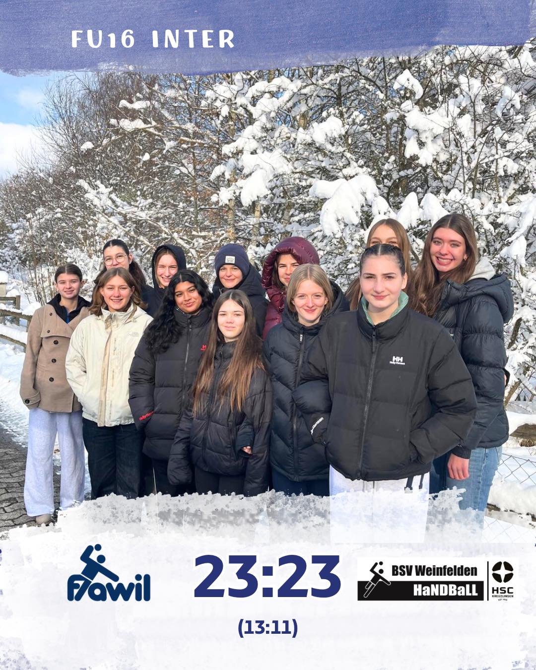 Die FU16 Inter-Mannschaft des BSV Weinfelden spielte vorgestern zum zweiten Mal gegen die SG Fürstenland Hornets. Zu Beginn des Spiels waren die St. Gallerinnen immer ein paar Tore voraus und konnten somit die erste Halbzeit mit 13:11 für sich entscheiden. In der zweiten Halbzeit spielten die Weinfelderinnen motivierter und zeigten mehr Teamgeist. So konnten sie aufholen und glichen kurz vor Spielende zum 23:23 aus.